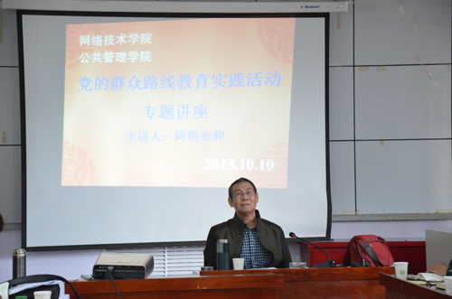 和网络技术学院共同邀请我国著名的党建研究、毛泽东思想研究、陈独秀研究专家阿明布和教授为全体党员、教师作党的群众路线教育实践活动专题辅导报告。公共管理学院党总支书记王雪莹老师和网络技术学院党总支副书记乾达门老师共同主持讲座,两个学院的全体党员、教师聆听了讲座。