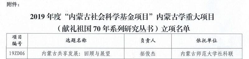 院长拓俊杰博士主持的“内蒙古共享发展:回顾与展望”(项目编号:19ZD06)获内蒙古学重大项目立项。作为献礼祖国70年华诞的内蒙古学重大项目,与公共管理学院建院10周年院内众多教师合作参与的项目,该项目具有一定的战略意义与现实意义。