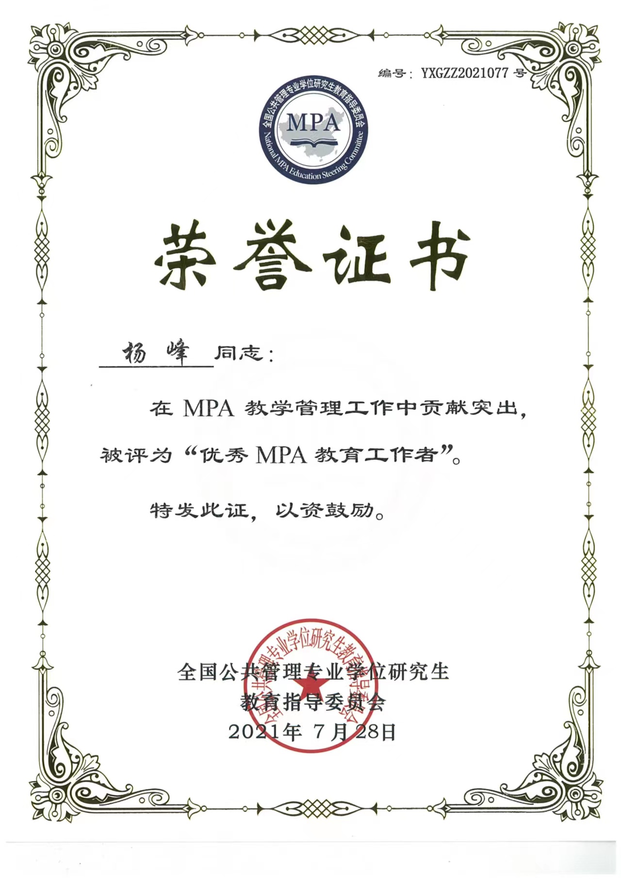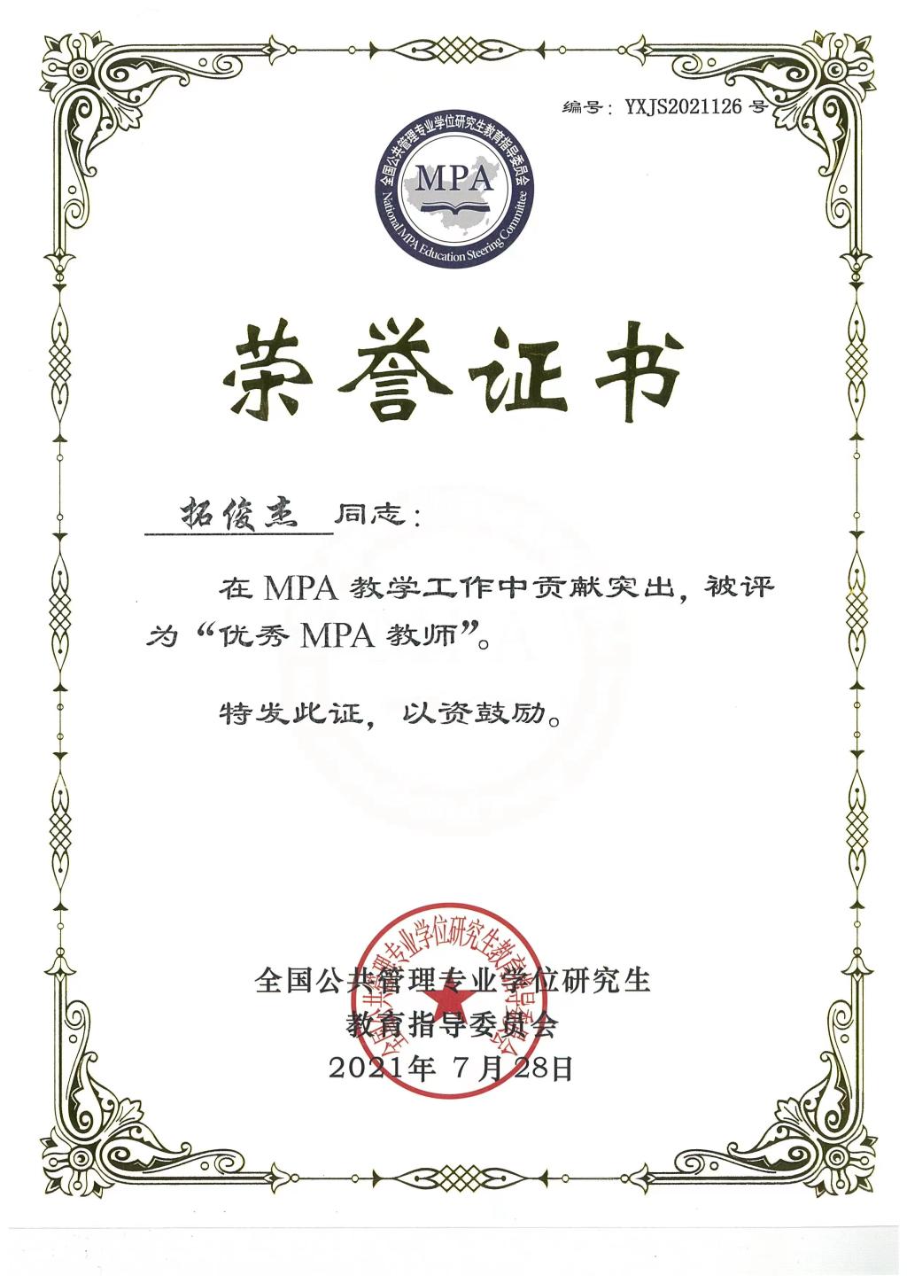 根据《全国优秀MPA教师和教育工作者评选办法》,经全国公共管理专业学位研究生(MPA)教育指导委员会组织审定,卡哇伊直播 院长拓俊杰教授、MPA中心主任杨峰老师分别获评第三届全国“优秀MPA教师”、“优秀MPA教育工作者”荣誉称号。