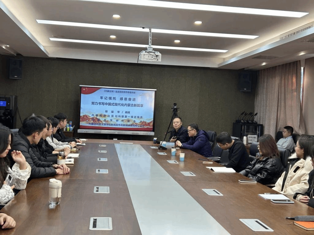特邀内蒙古自治区社科联原一级巡视员、政治学教授,现任内蒙古学研究会会长、内蒙古鸿德文理学院新闻发布和新媒体研究中心主任胡益华同志举行了一场精彩的讲座,讲座题目为“牢记嘱托 感恩奋进 努力书写中国式现代化内蒙古发展新篇章”,由研究生教育中心主任陈佳志老师主持。讲座现场座无虚席,学院领导、老师以及众多研究生同学齐聚一堂,共同聆听胡益华教授的深刻见解。