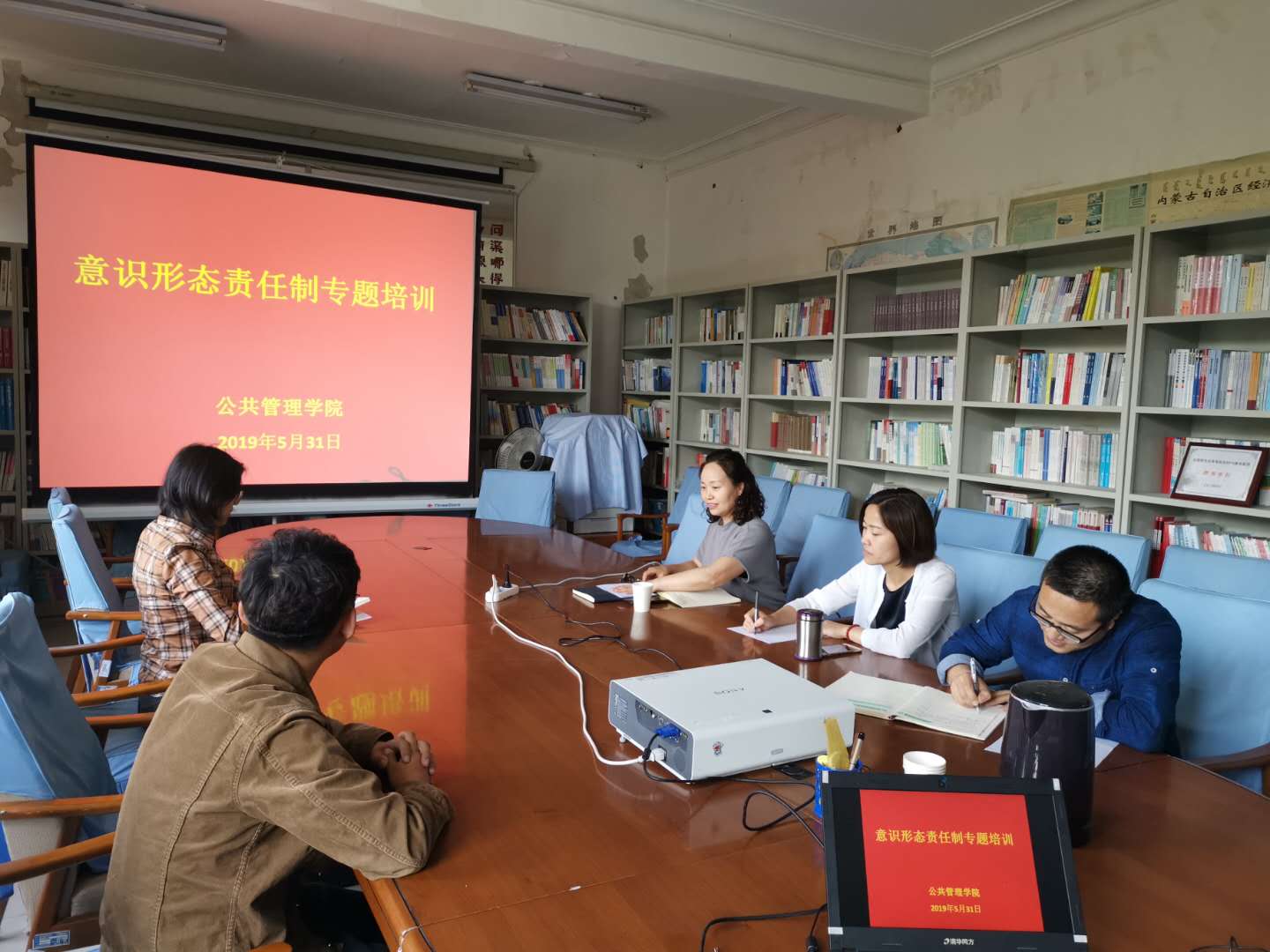 意识形态工作水平,增强教职工党员的意识形态安全意识,2019年5月31日下午,学院党总支在赛罕校区学院资料室召开意识形态责任制专题培训会。会议由学院党总支副书记乌日古木拉老师主持。