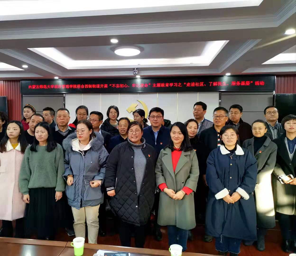 党总支联合呼和浩特市新城区西街街道办事处党工委,以“走进社区、了解民生,增长才干,服务基层”为主题,举行了一场别开生面的主题教育实践活动。本次活动以双方“不忘初心、牢记使命”主题教育经验交流为切入点,通过座谈、交流、报告和对特色社区、组织及服务的实地参观、走访等形式,教育并引导广大党员深入学习贯彻习近平总书记关于主题教育的重要讲话和党的十九届四中全会精神,坚守为党育人,为国育才,增长才干,服务社会的初心使命,让主题教育内容彰显学院特点、专业特色,突出专业导向、实践导向,通过深入基层听民声、访民情,真正让广大教职工、社区管理人员及人民群众都能切身感受到近年来特别是主题教育开展以来给高校和社区的广大师生百姓带来的实实在在、真真切切的新变化、新成效。