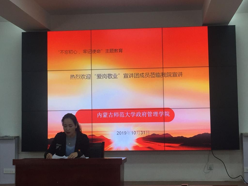 党总支举行“不忘初心,牢记使命”主题教育专题报告会,邀请学校2019年度“三育人先进个人”张晓阳、朱晓红老师进行典型事迹巡讲报告。本次专题报告由公共事业管理系党支部组织委员、院工会主席于莎日娜主持和点评,院党总支书记樊荣忠、学院副书记、副院长乌日古木拉等领导与老师参加。