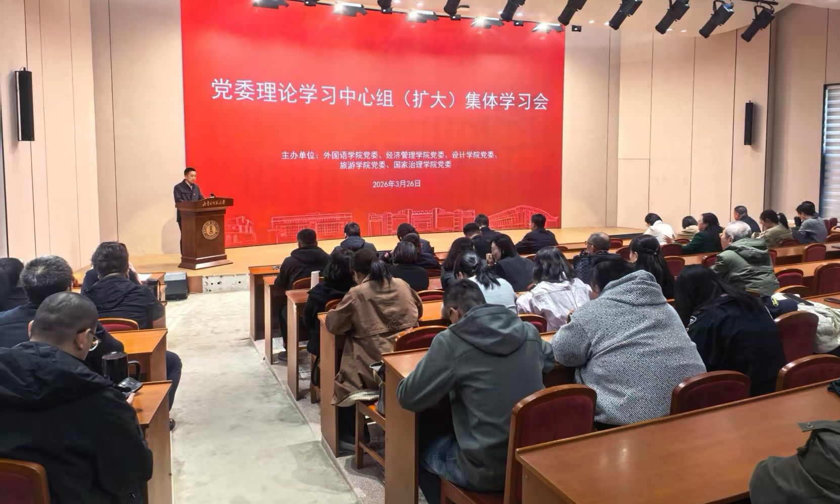 党委、旅游学院党委、设计学院党委在赛罕校区学术交流中心信息楼报告厅,联合举办党委理论学习中心组(扩大)集中学习会暨树立和践行正确政绩观学习教育读书班。五学院党委委员、科级干部、党员及教师代表共160余人参加学习,会议由外国语学院党委书记黄鑫主持。