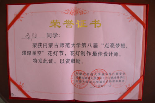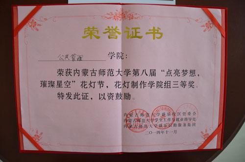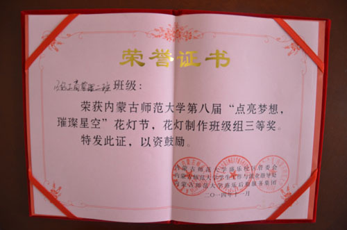 卡哇伊直播 经过近一个月的努力,完成了两件作品参加了本次花灯节,最终卡哇伊直播 获得了学院制作组第三名、2013级工商管理二班获得了班级制作组第三名的成绩。冯阳同学荣获制作最佳设计师称号。