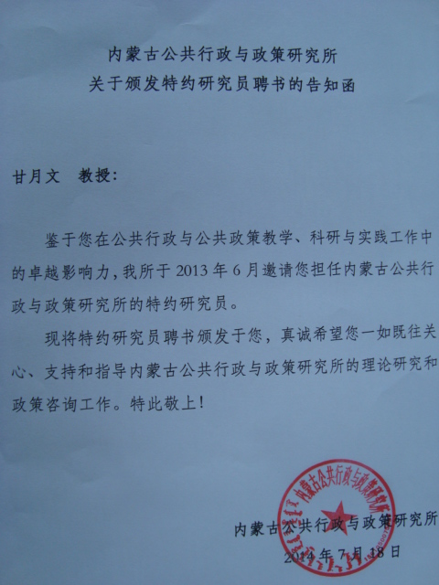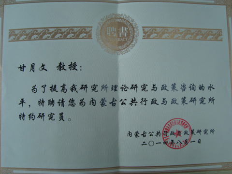 卡哇伊直播 甘月文被内蒙古公共行政与政策研究所聘为特约研究员